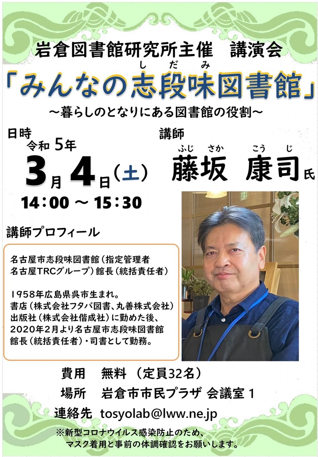 初めまして、岩倉図書館研究所です。図書館及び書籍と地域社会に関わる諸問題の研究と実践目的に設立したばかりの団体です。 このたび、さまざまな取り組みで注目を集める名古屋市立志段味図書館館長の藤坂